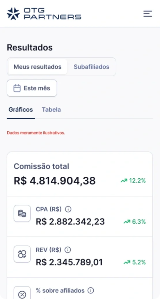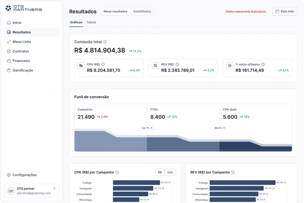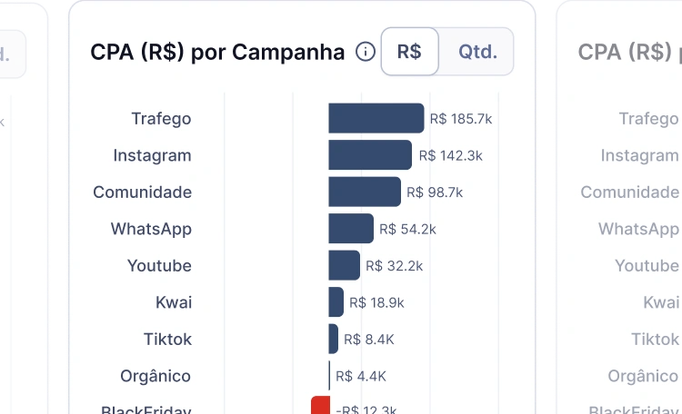 Acompanhe KPIs, receitas, conversões e métricas críticas, com visualizações limpas e objetivas.